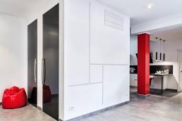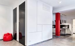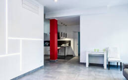 Si è venuto così a creare un unico spazio dal carattere “metafisico” in cui gli oggetti di arredo, le luci e i volumi sembrano sospesi in un gioco di equilibri, di citazioni e di rimandi coloristici.Il cubo di cui sopra nasconde al suo interno locali tecnici e serventi e, invece di esser occultato alla vista, viene esaltato come quinta architettonica e centro prospettico dello spazio. La spirale luminosa, al centro della parete del cubo, vuole con la sua presenza indicare ed esaltare il cuore pulsante del progetto.Il gioco di chiari e scuri è ben calibrato dando un senso di equilibrio a tutto il progetto, il pilastro rosso smaltato diventa l’eccezione che conferma la regola dell’equilibrio e, grazie alla brillantezza del suo colore, collabora a rendere discreta e leggera la presenza della struttura.