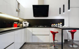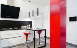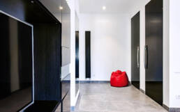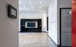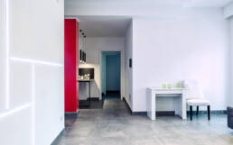 Un appartamento tipico degli anni 70, caratterizzato dalle molte stanze di piccole dimensioni e da un corridoio che attraversava tutta la casa dall’ingresso fino al terrazzo dividendo in due la casa.La nostra idea è stata quella di creare spazi più ariosi e funzionali in cui la connessione tra la zona giorno e la zona notte avvenisse con un unico disimpegno centrale di dimensioni ridotte.Il grande spazio del Salone è stato messo in contatto diretto con la cucina e, giostrando le presenze strutturali, dettate dai pilastri dell’edificio, abbiamo creato un cubo che faccia da quinta architettonica del salone e che scandisca le diverse funzioni dello spazio: ingresso, salotto, sala da pranzo, armadio a muro, lavanderia, cucina.